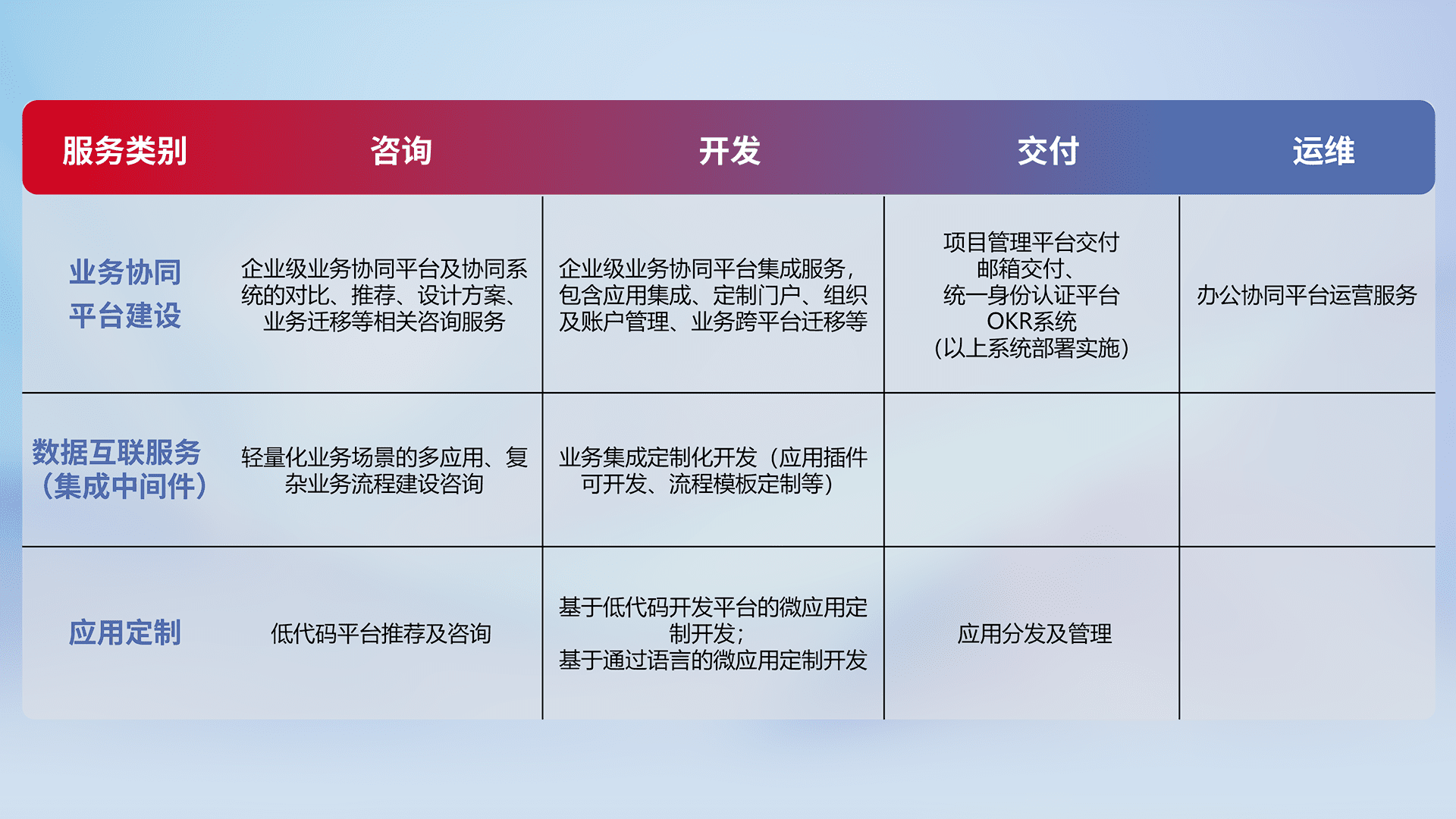 针对钉钉、、、企微、、IDaas等平台级产品提供产品的规划、、、、方案、、、、交付、、、定制化开发等服务,,,实现如统一协同办公、、、智能客户服务、、、混合会议管理、、、、智能数据查询、、、、等业务场景,,实现数字化转型。。